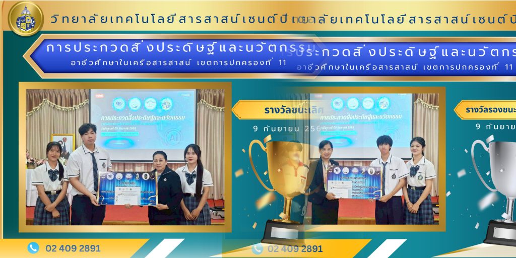 By admin / 21/09/2025 Post Views: 21 ขอแสดงความยินดีกับนักเรียนที่ได้รับรางวัลในการเข้าร่วมแข่งขันการประกวดสิ่งประดิษฐ์และนวัฒกรรม ที่จัดขึ้นโดย วิทยาลัยอาชีวศึกษา ในเครือสารสาสน์ เขตการปกครองที่ 11 ซึ่งเป็นการคว้ารางวัลชนะเลิศ อันดับ 1 และ อันดับ 2 สองปีซ้อน